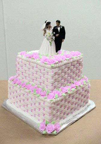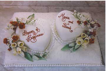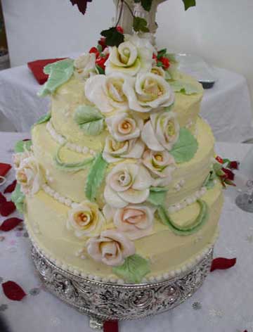 CASE STUDY #1: Tricia Boyer, Oceanside, CA Here are some photos of cakes Tricia made using the tips and techniques that will be featured in the new 2-Volume Set! Enjoy!  Roses, Leaves, & Spatula Striping  Tiers, Piping, & Smooth Buttercream  Basketweave, Borders, & much more! Here are some more photos of cakes that our readers have made using their own talents (and a bit of our advice). The tips and techniques they used, and many, many more will be spelled out, step by step, in our new two-volume set! Enjoy! CASE STUDY #2: Juanita Owen, Huntsville, AL  "Hi Sam, I just wanted to say I am so glad I found your website. I wish I had found it a lot earlier. I am a wanna-be cake decorator, have had part 1 and part 2 of the Wilton classes, but have learned so much more just by your few emails. Thanks for sharing your knowledge and expertise so my cakes can get a little better. I have attached a cake I did for my Mother and Father in-laws 50th wedding anniversary. Anyway, I learned a lot for the next big cake I do. Again, thanks for the real help." Juanita Owen, Huntsville, AL | CASE STUDY #3: Kathe Sadler, Placerville, CA  "Hi Sam, I've thoroughly enjoyed receiving your cake tips via email. They helped me with my first attempt at a wedding cake. And since this was my first, the lucky couple only had to pay for supplies. I learned a lot from your tips though and wanted to say, thanks. You taught me how to prevent the frosting from cracking (bride wanted butter cream frosting), how to prevent the separator plates from sticking, and lots more. Attached is a photo. I think it turned out okay, nothing great, just okay. Thanks again!" Kathe Sadler, Placerville CA | (Editor's note: "...just okay"??? It's BEAUTIFUL!) | CASE STUDY #4: Olga Yevich, Shelton, CT  "Hi Everyone! I just wanted to send a picture of my second cake that I baked. After the first cake, I made sure that I followed directions to a T. I made this cake for my in-laws 40th wedding anniversery. Everyone loved it! I showed pictures of this cake to my sister...she asked me if this was a cake that I was going to make. When I told her that I made it already, her mouth just dropped. The cake is a 4-layer butter cake with buttercream frosting and fondant. Thank you," Olga Yevich, Shelton, CT - retired EMT | CASE STUDY #5: Amanda A. Touchett, Lafayette, LA "Here is one of my latest and it is appropriate that you mentioned mixing your colors because I had to do that with both my buttercream and my fondant and the shades needed to match even after the buttercream hardened (and as you know, darkened!) Hope you like it Ð it was fun to make! Thanks!" Amanda A. Touchett | CASE STUDY #6: Chef Terri O, Phoenix, AZ  "Sam, Thanks for your tips and techniques. As you can see I have been working very hard and using your daily tips, I espically enjoyed the glazing tip. Thank you both!" Chef Terri O | CASE STUDY #7: Anneke Jansen, Tucson, AZ  "Hi Michael, Thanks to you I found a new hobby, making cakes. I never made a cake in my life, but I like to play with clay, and one day, a friend ask me to make her a wedding cake for her very small wedding, and because they are friends, and they will forgive me if the cake turned out not so great, I promised her I will give it a try. So the first thing I did was go to the internet, and I found you, ordered the book, did what you told me, and this is the result, not too bad, but I did made a big mistake, I just used the butter flavor shortening, that is the reason the cake is .... well, say...... so yellow.... But for the rest, I think it tasted and look ok. And now I am making cakes all the time. And because I am still learning how to do it, I only charge people for the material. The wedding cake you see cost me only 15 dollars. I can not do it without your help, thank you!" Anneke | CASE STUDY #8: Norma Buccianti, Orlando, FL  "Dear Sam, Thank you for the delicious Red Velvet Cake recipe. My husband took a picture and I think that it looks beautiful.
